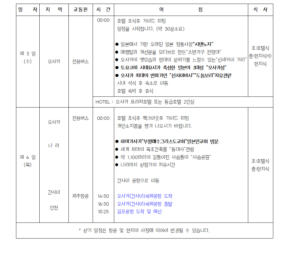 ● 2코스 : 오사카,고베,교토 3박4일 일정표